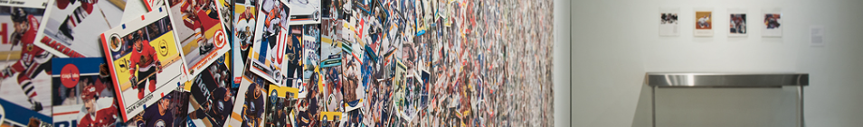 Peinture canadianne is an ongoing series of installations that comprise 3000 hockey cards arranged to mimic the patterns and trends of Canadian abstract painting from the 1940s and 1950s. Recalling the aesthetics of canonical works by artists, such as Jean-Paul Riopelle, this monumental fresco made of disposable and collectible everyday objects is a pastiche of brush strokes, colour, and scale. In the context of Power Play: Hockey in Canadian Contemporary Art, Peinture canadianne translates into an extra-large portrait that frames the faces of hockey’s past, moments of hyper-masculinity, elaborate styles of facial hair, stereotypical hockey helmet hairstyles, and action-filled facial expressions. Peppered with humour, the work is both an homage to the history of hockey’s mass production in popular culture as well as a tribute to the speed of the game. Instead of overlapping thick impasto brushstrokes on canvas, Phaneuf layers hockey cards onto a white wall to resemble the speed and ephemerality of gestural painting.